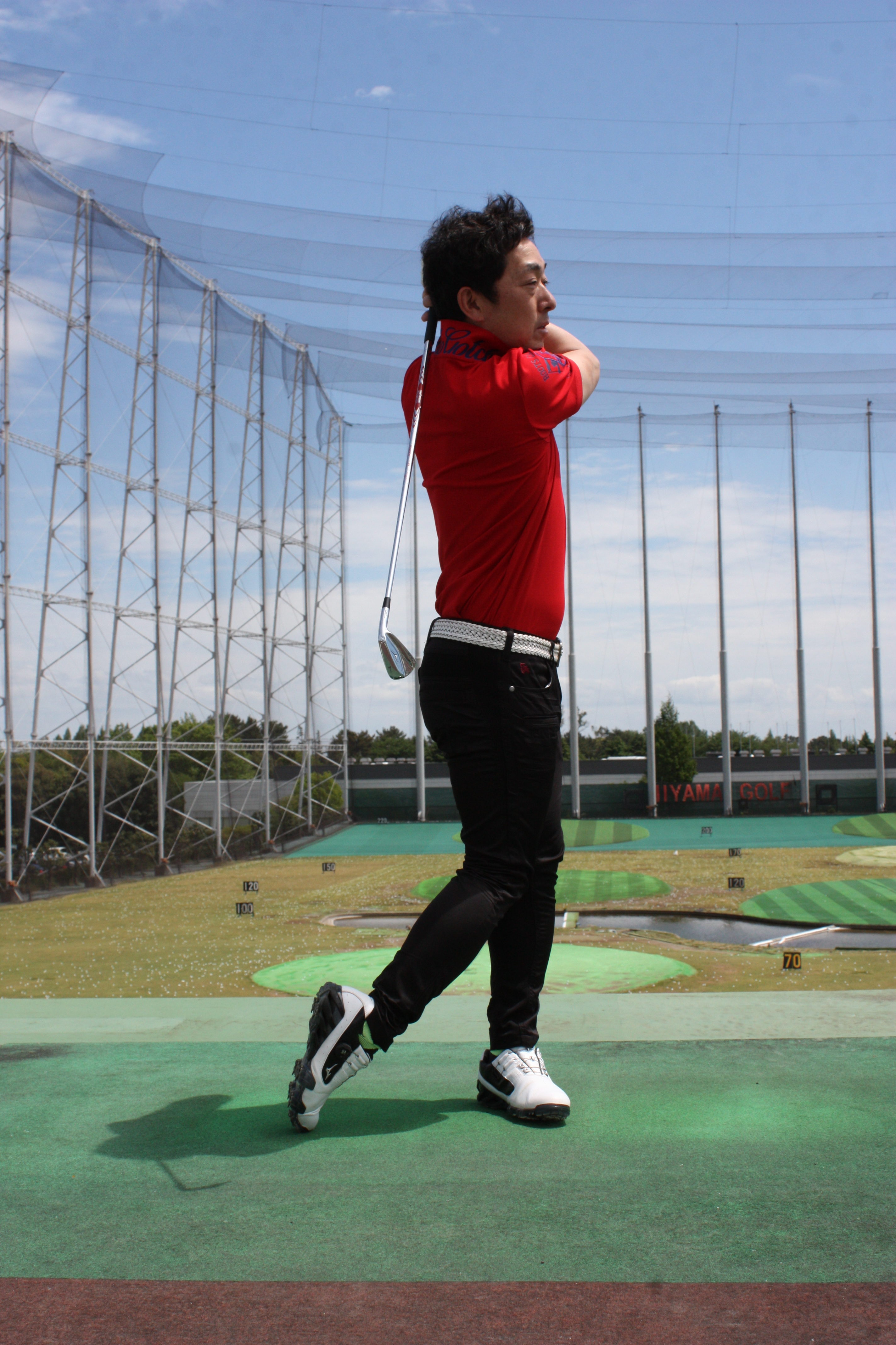 フルスイングのトップオブスイングは、コの字スイングと同じです。フルスイングのフィニッシュの姿勢は、クラブを肩に担ぐ肘のたたみ動作に、体を最大限に回転させる回転量の80%まで体を回転させる動きが合成されてつくられます。また、下半身の動きは9-3スイングの動きです。